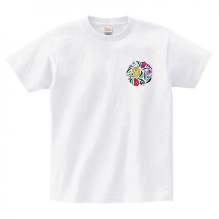 フリージア畑に咲く黄色・白・ピンク・パープル・赤の全色を円形にデザインし刺繍しました。