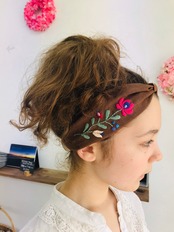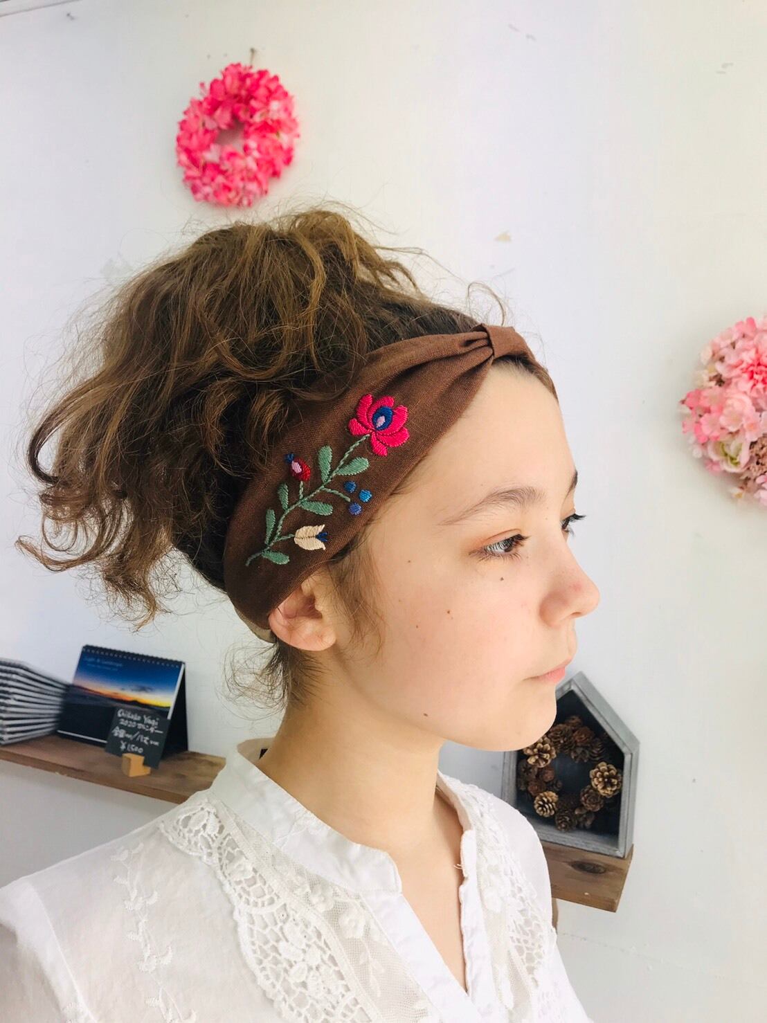 【手刺繍】カロチャ刺繍のリネンヘアバンド(ブラウン)