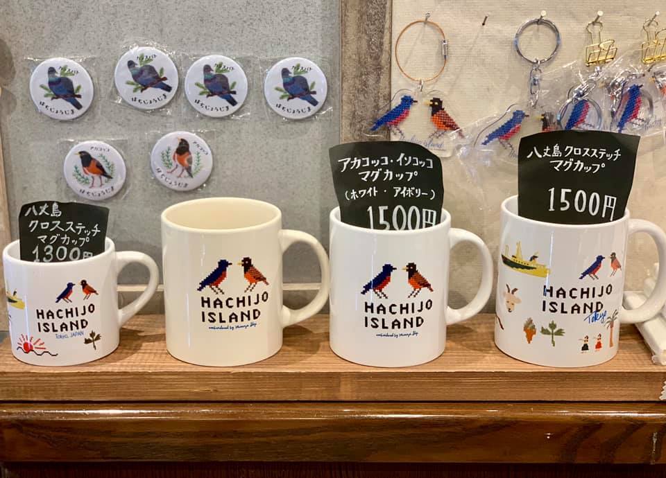 八丈島のモチーフをクロスステッチで刺繍し、マグカップにプリントしました!